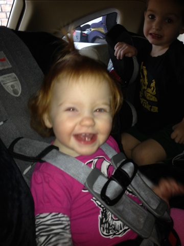 Abby has her first pony tail today. I tried for 25 minutes in the house before realizing that moms do kids' hair in the car, when they are strapped in and can't move for a reason. Shes growing up so fast!